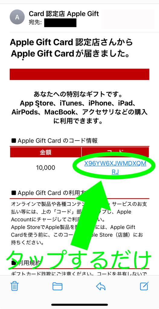 楽天市場で買うというひと手間がかかりますが、Apple Gift Cardのギフトコードはメールですぐに送られてきますし、登録もリンクをタップするだけと非常に簡単👇