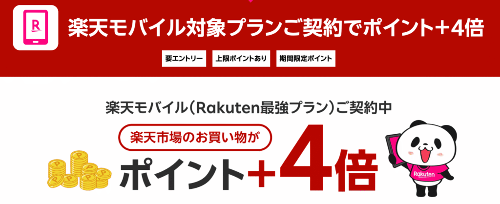楽天モバイルを契約していると、楽天市場の買い物が常時+4倍になります。