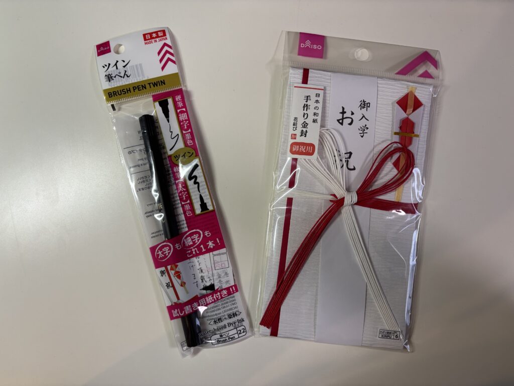 のし袋、ふくさ or 風呂敷、筆ペンなどの準備品全てダイソーで揃えられます。