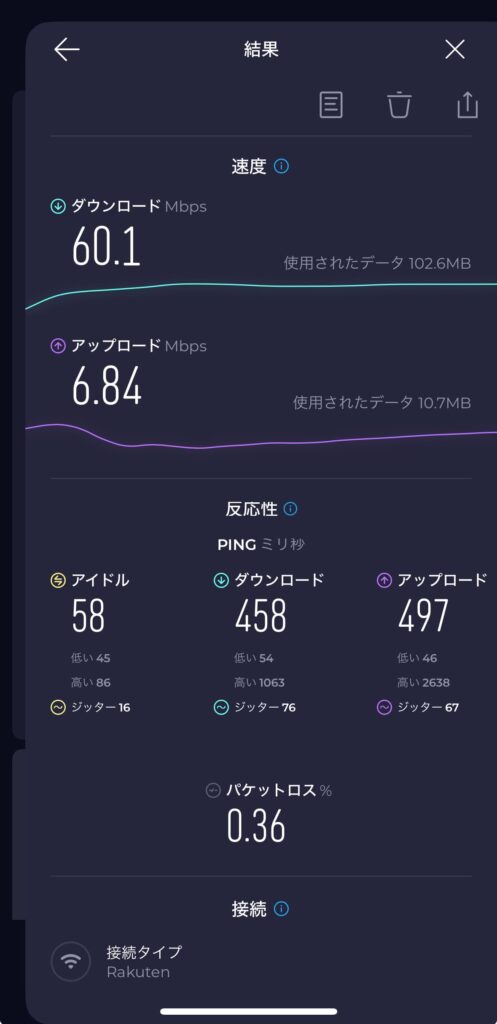 楽天モバイルの回線は4Gエリアですが、日常の使用に不足ない十分な速度が出ています。